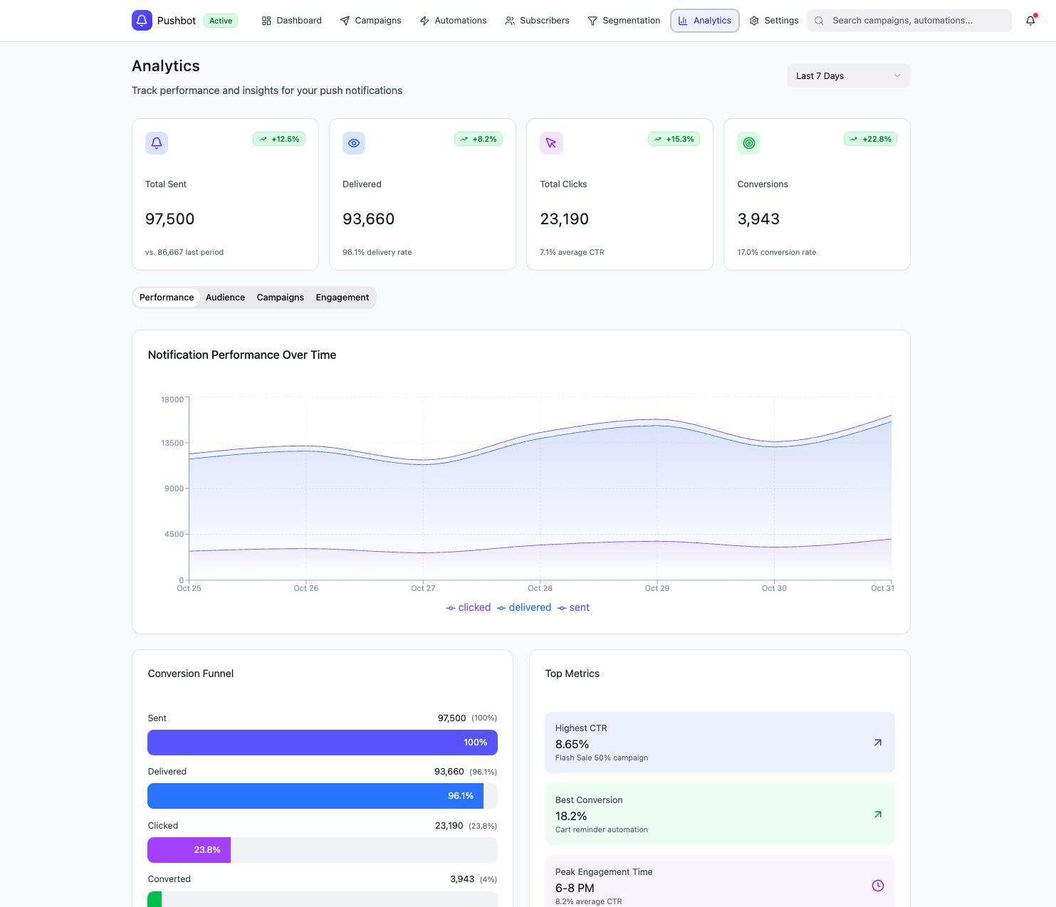 Track total sent, delivered, clicks, and conversions. See exactly how your push notifications are performing.