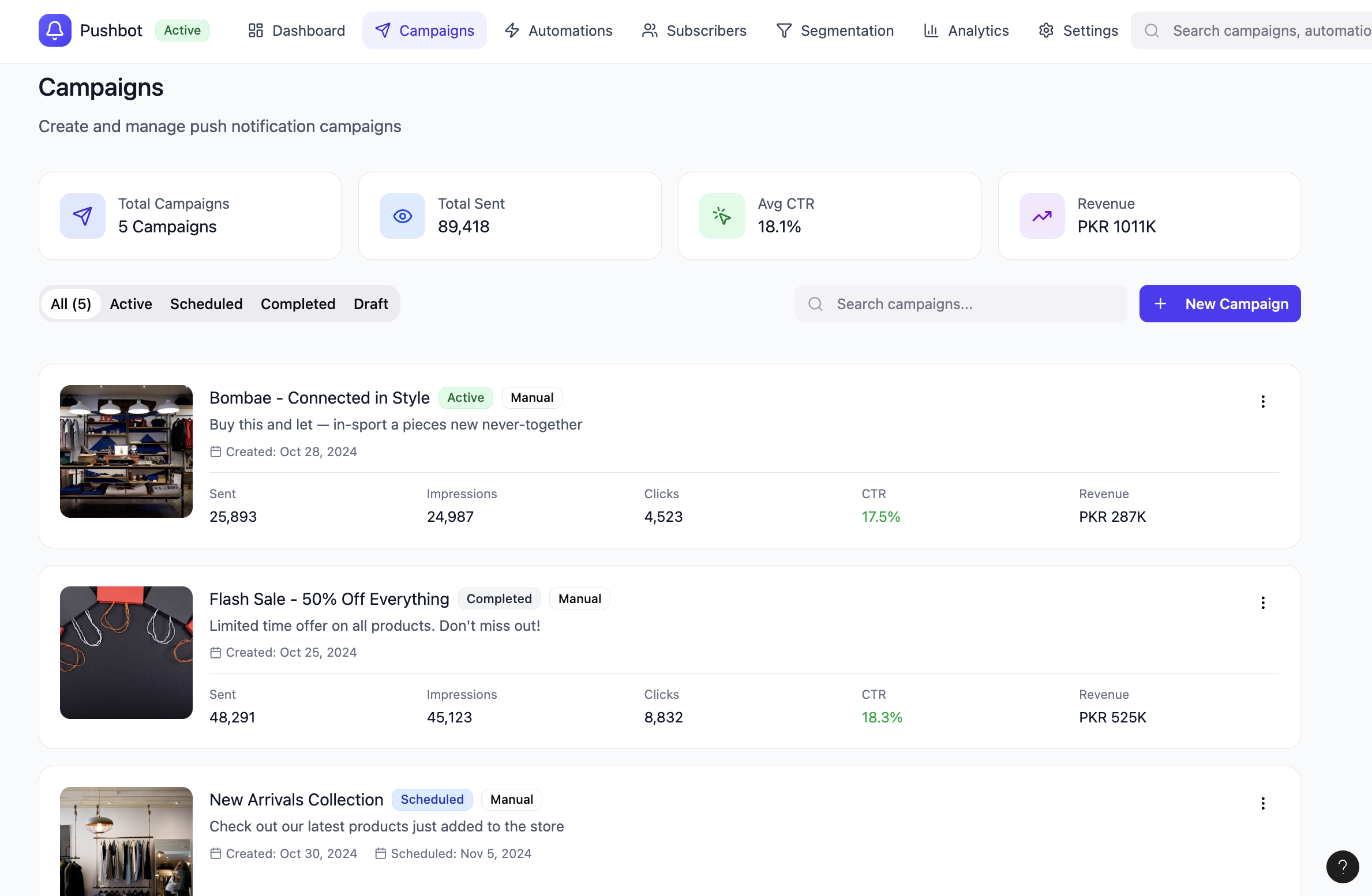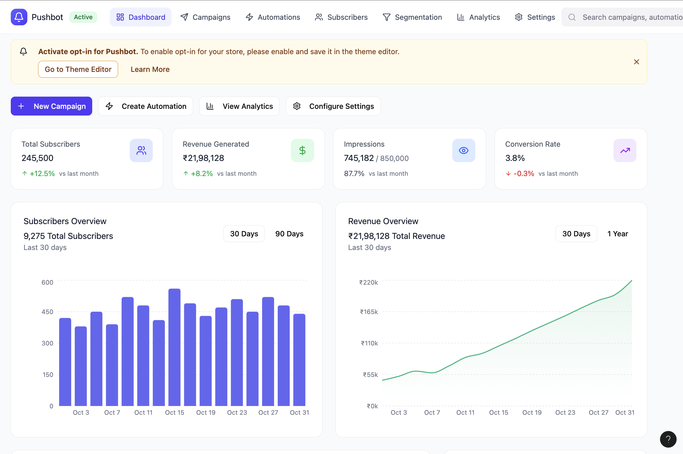 Set up automated push notifications for abandoned carts, price drops, back-in-stock alerts, and more. Engage customers at every stage of their journey.