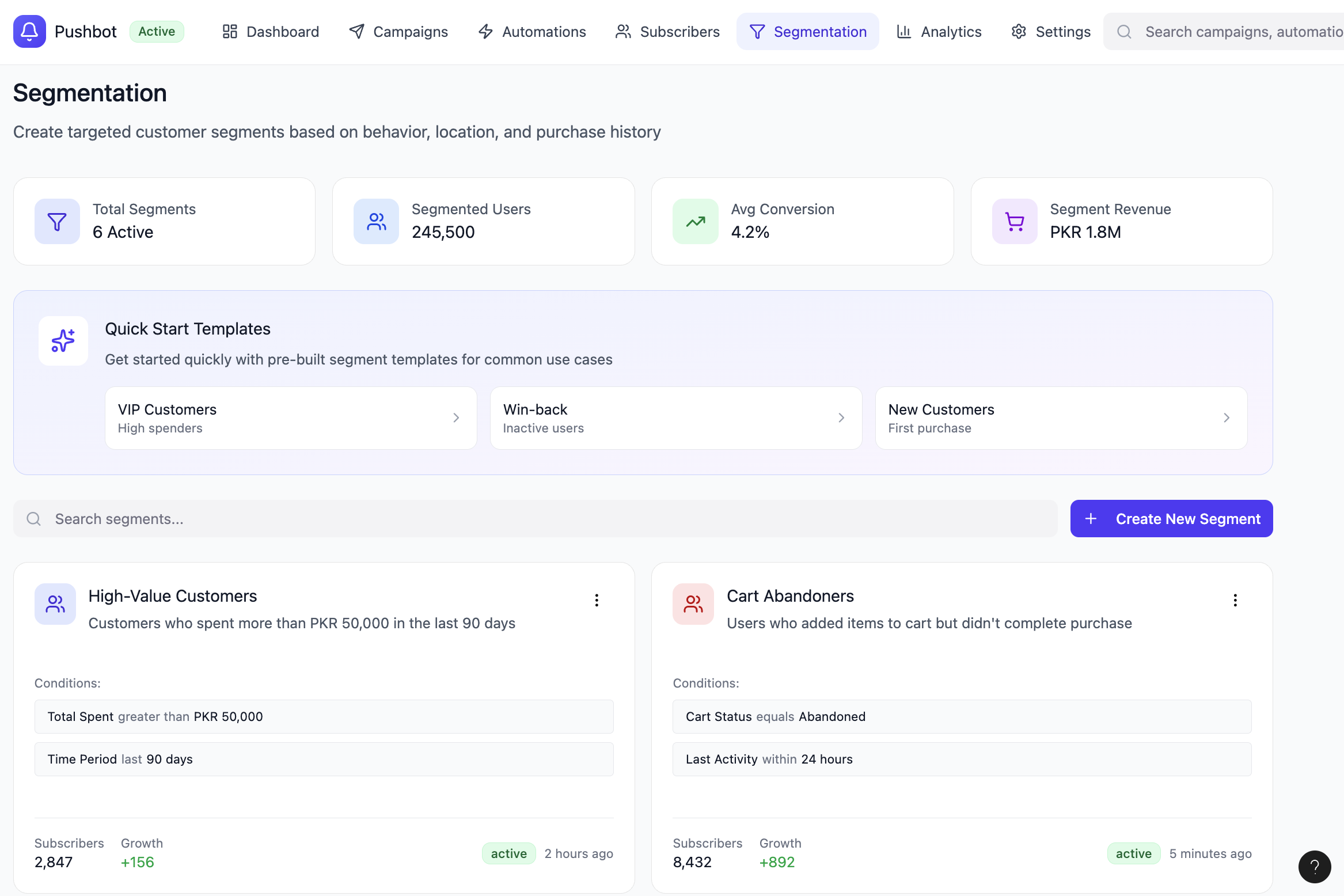 Create powerful customer segments based on behavior, location, and purchase history. Send personalized messages to VIP customers, cart abandoners, and more.